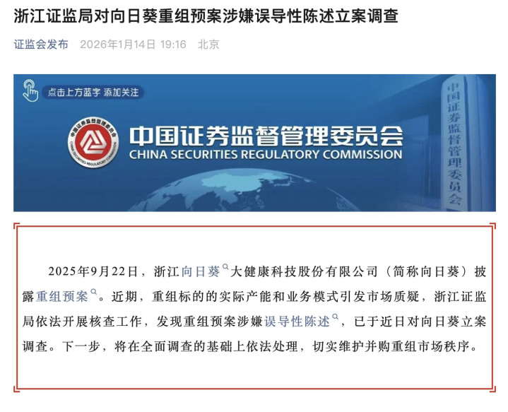 2025年9月22日,浙江向日葵大健康科技股份有限公司(简称向日葵)披露重组预案。近期,重组标的的实际产能和业务模式引发市场质疑,浙江证监局依法开展核查工作,发现重组预案涉嫌误导性陈述,已于近日对向日葵立案调查。下一步,将在全面调查的基础上依法处理,切实维护并购重组市场秩序。