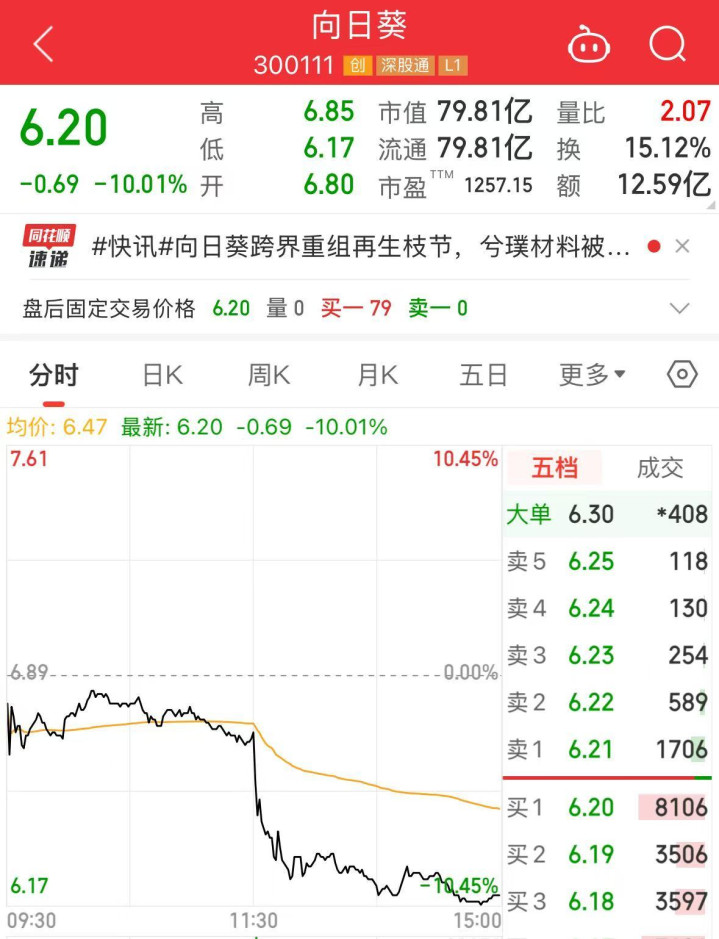 盘面上,截至A股今日收盘,向日葵(sz300111)股价大跌10.01%,报6.2元,总市值79.81亿元。